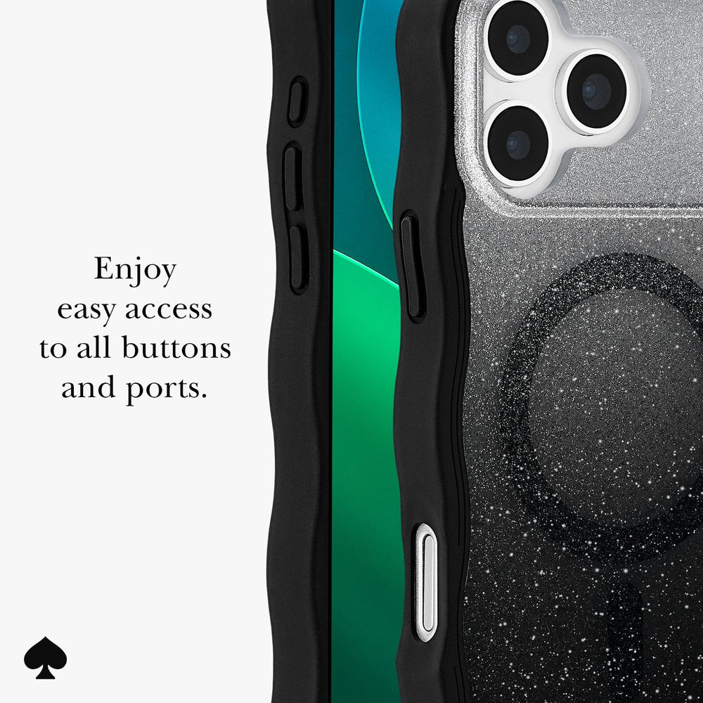 The kate spade new york Wavy MagSafe Phone Case adds a fun touch to your mirror selfies with a unique wavy design and black glitter ombré! This phone case is made to keep up with your daily to-do list thanks to 12-foot drop protection, while built-in magnets let you wirelessly charge and accessorize in a snap.